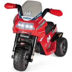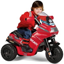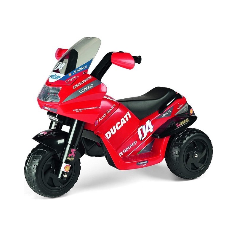 Piccoli Ducatisti crescono con la mitica Ducati Desmosedici Evo per bambini Questo gioiello made in Italy mostra tutta la sua EVOluzione con caratteristiche ancora più performanti Luci suoni musiche e clacson per divertirsi già dai 2 anni La moto elettrica funziona con batteria ricaricabile da 6V 4 5Ah 25 Wh
