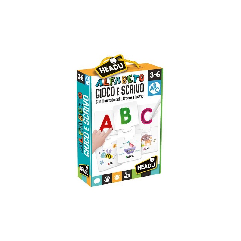 Età 3 6 Con il metodo delle lettere a incavo Impara l alfabeto pronuncia le parole e traccia le iniziali con il pennarello cancellabile Con il nuovo metodo delle lettere a incavo scrivere è davvero un gioco divertente Conoscere l alfabeto Imparare a scrivere Affinare il gesto grafico Ampliare il lessico 26 minupuzzle dell alfabeto con lettere a incavo 7 lavagnette prescrittura a incavo Pennarello cancellabile Istruzioni Made in Italy