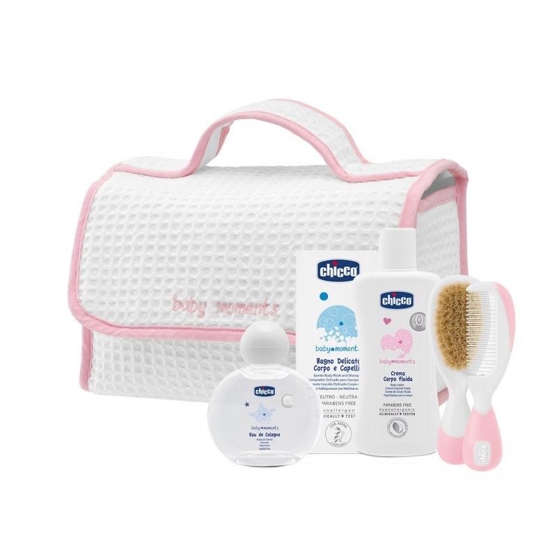 Un beauty case in morbido cotone piquet con maniglia e tasche interne racchiude il necessario per coccolare il piccolo durante e dopo il bagnetto