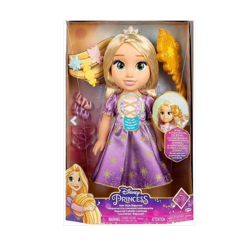 Bambola articolata di Rapunzel con inclusa una spazzola magica che attiva la funzione capelli luminosi e le fa cantare la fantastica canzone I see the lights inoltre inclusi elastici e mollettine per divertiti a crearle meravigliose capigliature