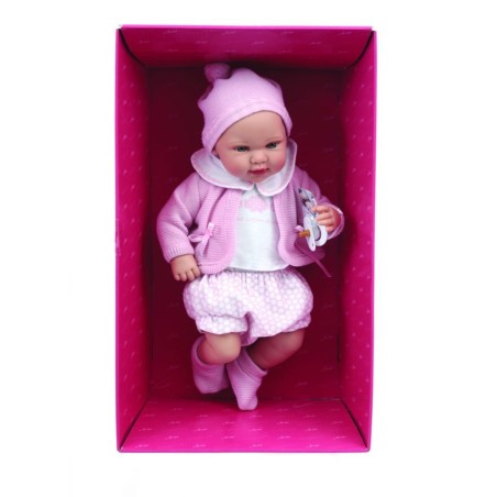 Dolce bambola dai tratti realistici e corpo morbido delicatamente profumata con ciuccio incluso Indossa un elegante completo con gilet di maglia coulotte a pois e berretto abbinato con suoni e un elegantissimo outfit ricamato Colore rosa Altezza bebè 45cm