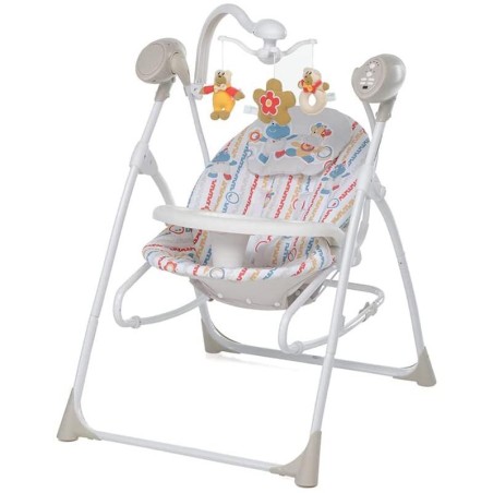 Sdraietta altalena carillon è un dondolo musicale con dispositivo di movimento della seduta e con diverse melodie con volume regolabile Dotata di telecomando per attivare a distanza il movimento Sistema a dondolo con dispositivo di bloccaggio e sbloccaggio con movimento basculante a più velocità Vassoietto amovibile barra rotante con peluche e luce con diversi colori Testata a normativa europea