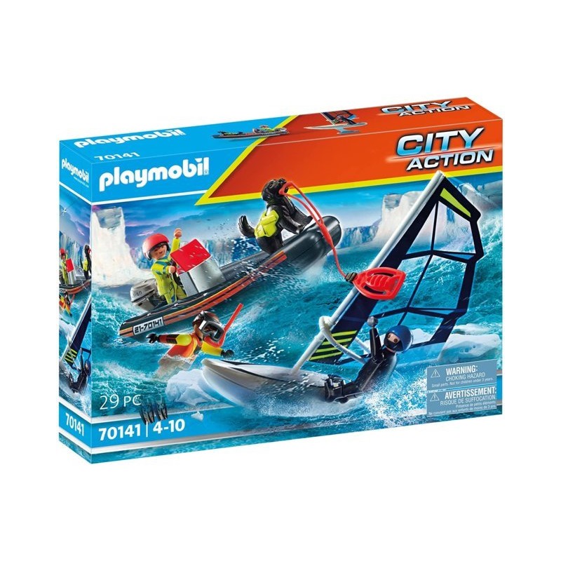 Attenzione eroi Gommone della Guardia Costiera PLAYMOBIL con tavola da surf 1 surfista 1 sommozzatore 1 soccorritore e 1 cane da salvataggio per la missione in alto mare