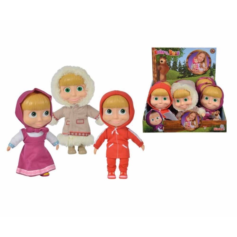 Bambola Masha 23 cm Corpo morbido e viso in vinile 3 versioni di abiti invernali