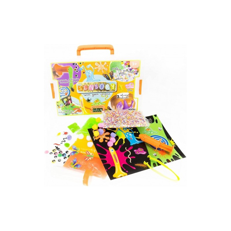 Usa la valigetta come area di lavoro versa le 3 buste di SLIME colorati schiaccia e strizza con le manine che strana sensazione Aggiungi una cascata di coloratissime palline pom pom occhietti Immergi gli insettini e poi prova a pescarli con le pinze aggiungi il glitter e prova a spremere lo SLIME con l apposita siringa prova a raccogliere la tua pozione appiccicosa nella provetta Inserisci il fondale con i buffi mostriciattoli e pasticcia con la fantasia alla scoperta di viscide creature si consiglia di lasciare i bambini scoprire da sé le potenzialità del gioco e sviluppare in maniera autonoma i loro peculiari interessi per i materiali e gli elementi proposti nel set