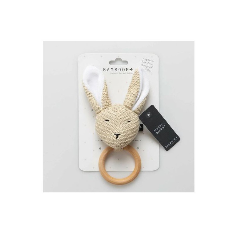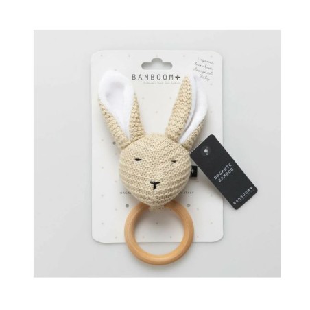Per il periodo della dentizione il massaggiagengive in legno è un accessorio indispensabile Decorato con una simpatica testa di coniglietto in morbida fibra di bambù lavorato a maglia Disponibile in