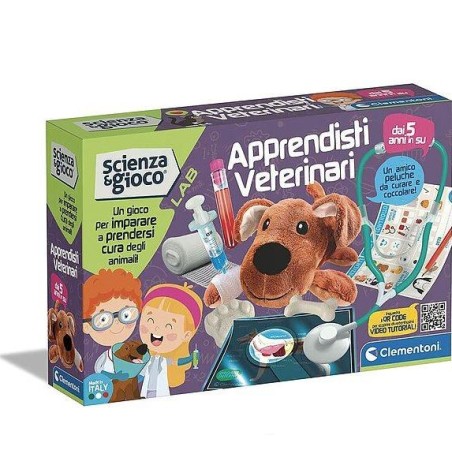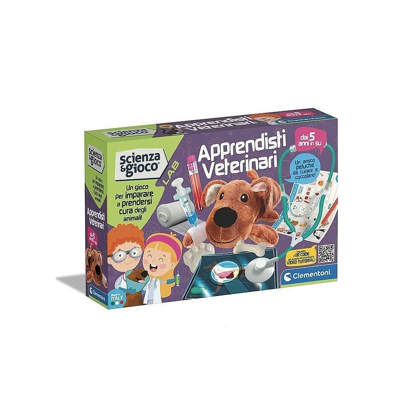 Per tutti i bambini che sognano di diventare veterinari un fantastico kit di scienza per tuffarsi alla scoperta di questo bellissimo mondo Un gioco per immedesimarsi nei panni di un vero veterinario uno dei mestieri che più affascina i piccoli per apprendere tante informazioni e curiosità sull anatomia degli animali e su come prendersene cura Il gioco contiene un dolce peluche da curare e tutto l occorrente per farlo al meglio come stetoscopio bende provette garze uno speciale collare schede anatomiche raggi x e manuale illustrato Inoltre è disponibile un fantastico video con un simpatico veterinario che spiegherà ai bambini le diverse attività del gioco facilmente raggiungibile inquadrando il QR CODE sulla scatola Un laboratorio per bambini appassionati di animali scienza e natura ideale a partire dai 6 anni Questo kit da esploratore allena la concentrazione e stimola la memoria sviluppa la struttura del pensiero e del ragionamento migliora il controllo e la coordinazione mani occhi Made in Italy