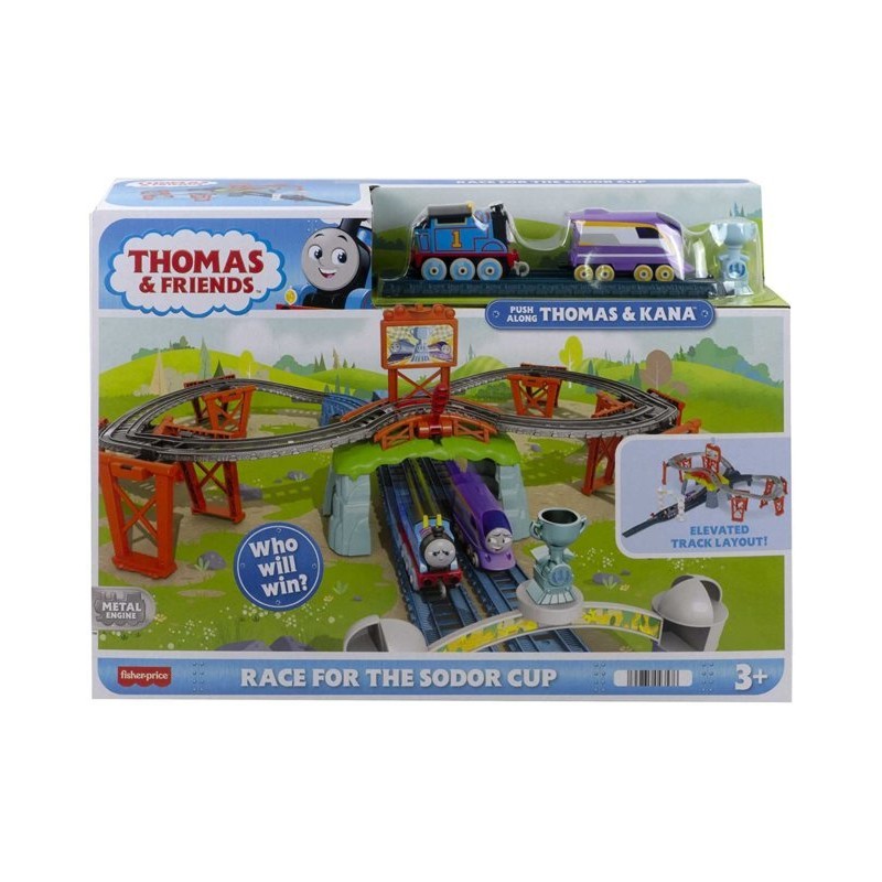 La pista Il Trenino Thomas con trenini a spinta si ispira alla simpatica sfida testa a testa tra Thomas e la sua amica Kana Basta usare la leva per far sfrecciare le locomotive lungo pista e verso il traguardo per vincere la Sodor Cup