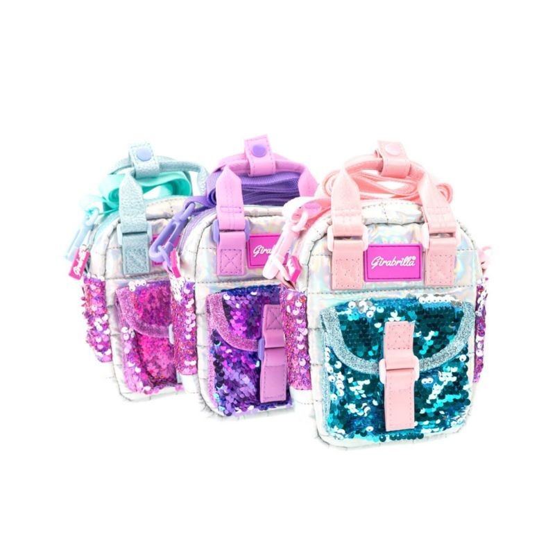 La Puffer Bag presenta una tasca frontale con apertura a bottone magnetico in paillettes reversibile Girabrilla lo scomparto principale è dotato di chiusura con cerniera zip Il rivestimento della borsetta è in tessuto nylon impermeabile La tracolla è regolabile a piacimento ed è possibile anche il trasporto a mano grazie alle pratiche maniglie in tessuto apposte nella parte superiore E disponibile in tre E perfetta per essere usata come borsetta da passeggiata per il tempo libero come porta oggetti o porta cellulare compatibilmente con le dimensioni