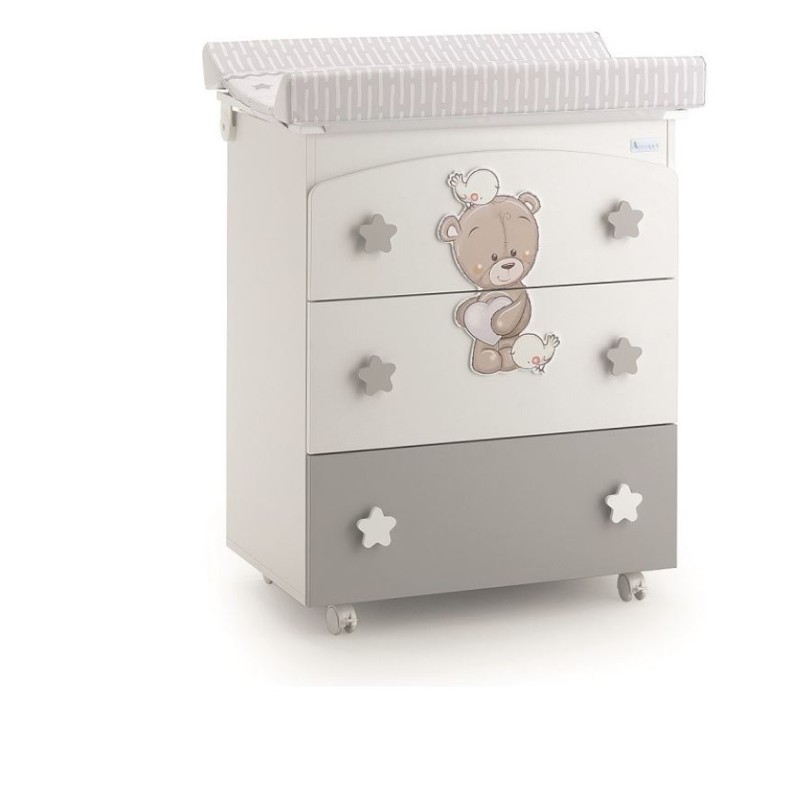 Il bagnetto e fasciatoio permette di prendersi cura del bambino in comodo e sicuro il piano fasciatoio per il cambio che include il materassino lavabile con rialzi lungo il bordo ha la funzione di coperchio infatti grazie alle cerniere con blocco di sicurezza permette di scoprire la vaschetta anatomica i tre ampi cassetti permettono di tenere in ordine la cameretta riponendo accessori e vestitini la struttura costituita da pannelli bilaminati ed i cassetti dispongono di guide in metallo viene consegnata già montata mentre sarà sufficiente montare parte delle cerniere del piano le ruote ed il decoro il bagnetto è conforme alle normative di sicurezza e sono state utilizzate solamente vernici atossiche Due cassetti di colore Bianco con applicazioni e pomelli a stella in grigio un cassetto di colore grigio con pomelli in contrasto a stella bianchi Qualità artigianale made in italy