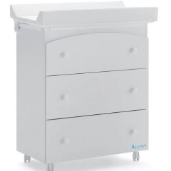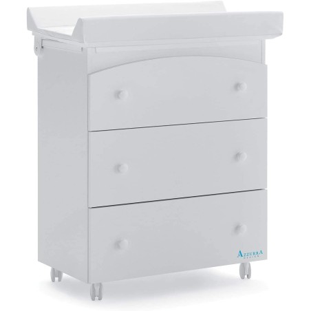 Bagnetto Fasciatoio Cassettiera Azzurra Design Tre colore bianco con 3 cassetti 3 ampi cassetti 4 ruote piroettanti di cui due con freno ripiano fasciatoio con morbido materassino pvc munito di bordi anti caduta vasca per il bagnetto ripiano fasciatoio con apertura di sicurezza per evitare chiusure accidentali durante il bagnetto del piccolo vernice atossica Dimensioni cm 76x49x89 h