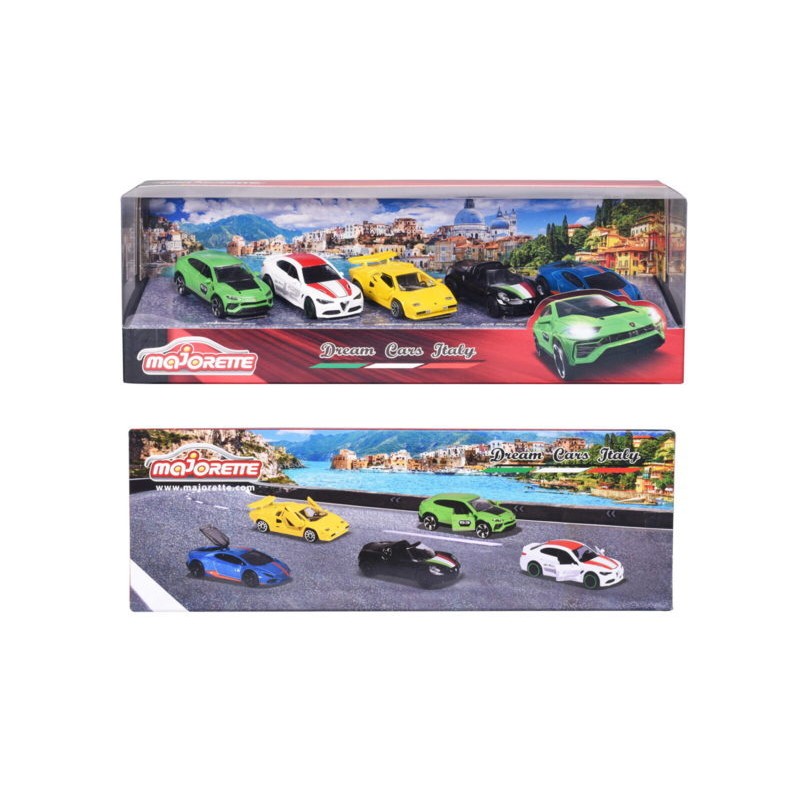Set di 5 macchinine in metallo Dreams Italy lunghezza cm 7 5 Majette Dream Cars Italy 5 macchinine italiane in confezione regalo modellini di auto per collezionisti o bambini dai 3 anni in su Il set regalo Dream Cars Italy contiene cinque auto da sogno italiane realistiche e di alta qualità Alfa Romeo 4C Spider Lamborghini Countach LP 400 Lamborghini Hurac e aacuten Avio Lamborghini Urus e Alfa Romeo Giulia