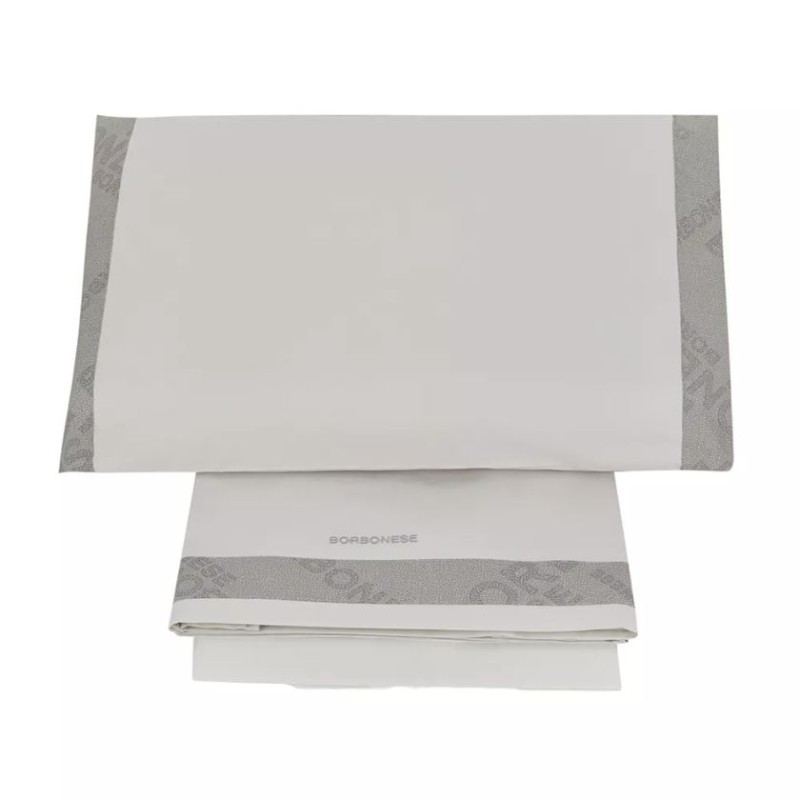 Completo lenzuola per culla in percalle di puro cotone 200 T C con inserti stampati con iconico design che ricrea il logo Borbonese con la texture OP Occhio di Pernice su bordi del lenzuolo e feder