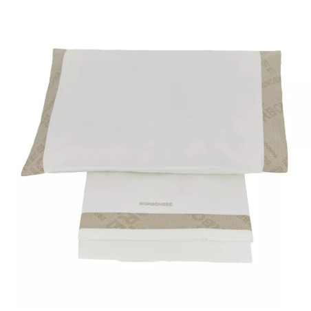 Completo lenzuola per culla in percalle di puro cotone 200 T C con inserti stampati con iconico design che ricrea il logo Borbonese con la texture OP Occhio di Pernice su bordi del lenzuolo e feder