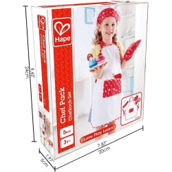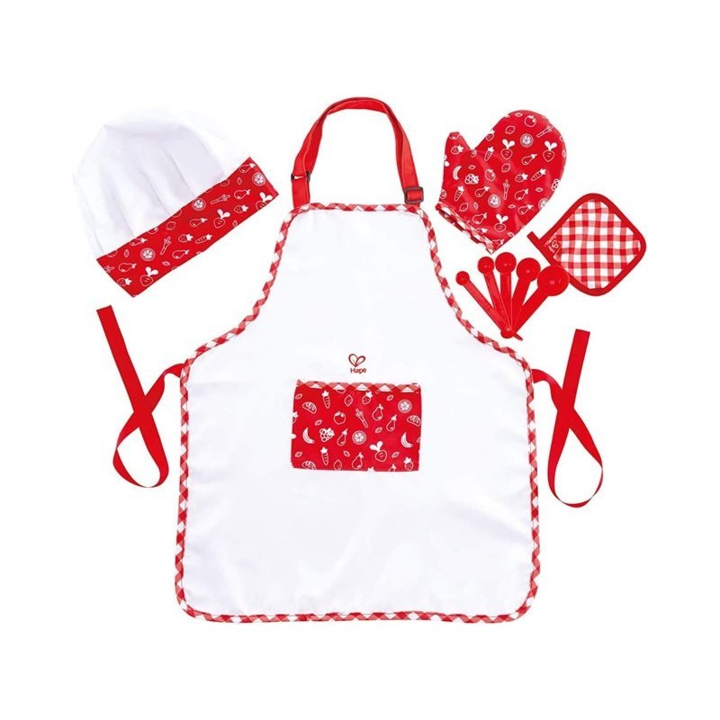 Ingredienti un cappello da cuoco un grembiule un guanto da forno una presina e cinque misurini I misurini e altri accessori possono essere riposti nella tasca del grembiule
