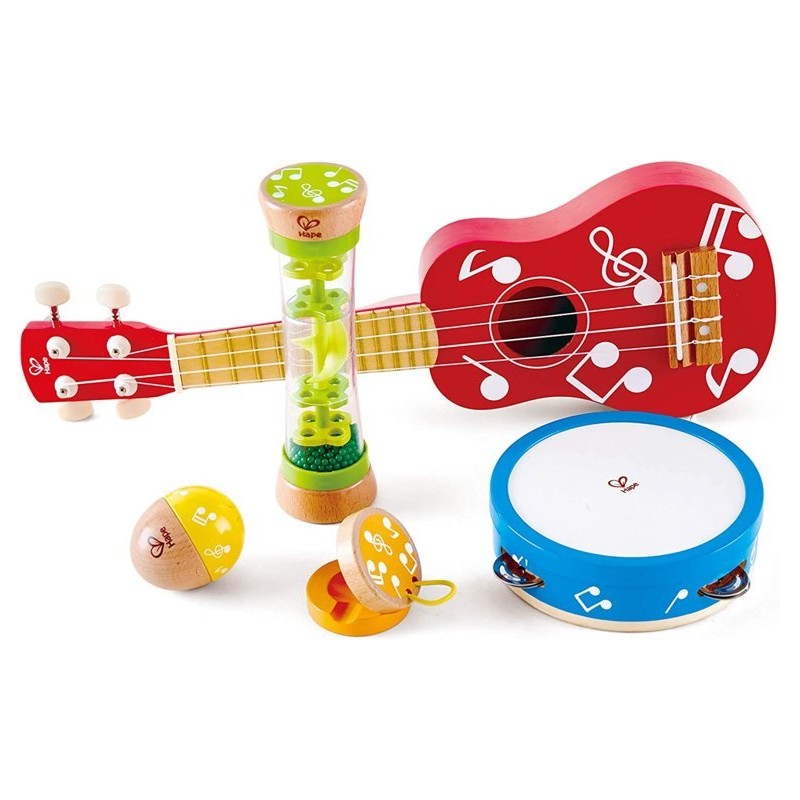 Con questo set è possibile iniziare ad imparare a suonare ukulele tamburello nacchere sonaglio e bastone della pioggia