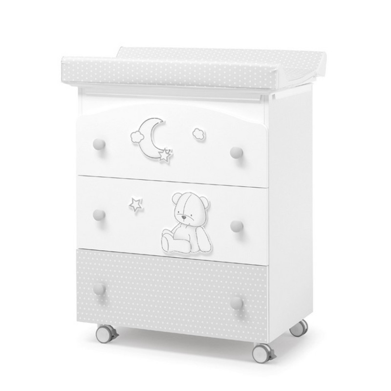 Il bagnetto Fasciatoio Stella è realizzato in legno di prima qualità E1 e rivestito in PVC presenta un coperchio fissato con delle cerniere per nascondere la vaschetta anatomica ed antiscivolo le maniglie in legno di faggio 4 ruote piroettanti con superficie di gomma anti traccia due di cui hanno il freno