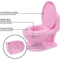 La pratica rende perfetti quando si tratta di abituare il bambino all uso del vasino quindi quale modo migliore per farlo se non quello di utilizzare questo realistico vasino educativo che riproduce un WC in miniatura Una volta che il tuo bambino ha terminato di usarlo puoi abbassare il coperchio e premere la maniglia dello scarico che emette un suono di sciacquone realistico Dopo aver festeggiato assieme al bambino i suoi progressi puoi rimuovere il contenitore interno gettare il contenuto nel WC e pulirlo con facilità