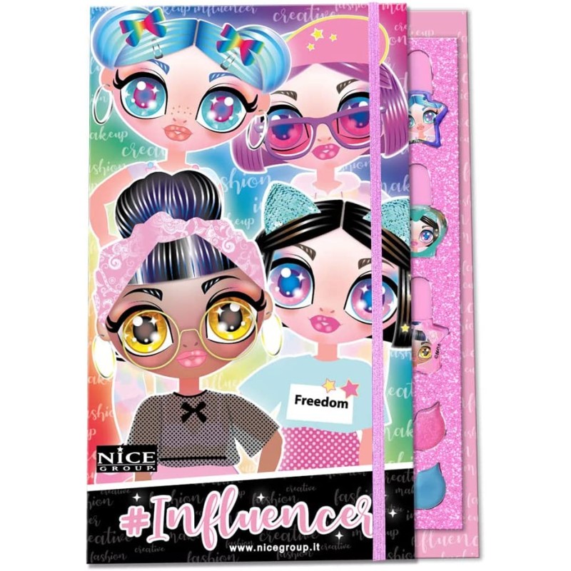 INFLUENCER Make Up Book è un libro trucco per bambini con un ricco assortimento di cosmetici collocati nel vassoio a effetto glitterato rosa e accompagnato da un libricino tutorial per imparare a truccare viso ed unghie