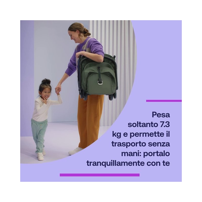 Leggero e facile da trasportare questo passeggino da 7 3 kg è certificato per i viaggi chiusura in un unico pezzo 23 x 45 x 54 cm si può trasportare dalla tracolla integrata o dal poggia piedi