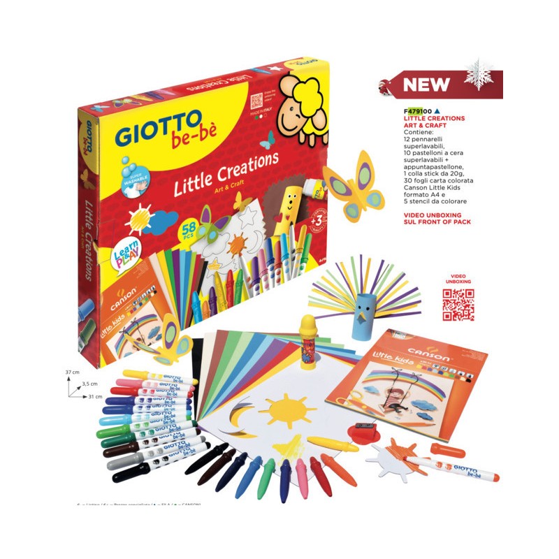 Contiene 12 Giotto be be pennarellli super lavabili 10 Giotto be bè pastelloni cera 1 Giotto be bè appuntapastellone 1 Giotto be bè colla stick 20g 30 Fogli colorati A4 CANSON LITTLE KIDS 5 stickers da staccare e colorare o usare come stencils