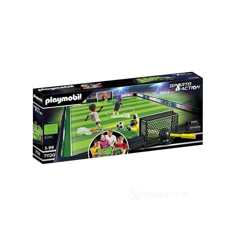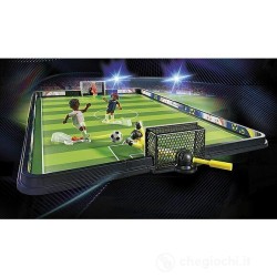 I giocatori hanno terminato il riscaldamento l atmosfera nello stadio è rovente e non manca molto al fischio d inizio Ecco che parte il big match sul campo da calcio PLAYMOBIL I bambini amanti del calcio possono divertirsi con il campo da tavolo scontrandosi in partite mozzafiato Entrambi i calciatori PLAYMOBIL sono dotati di un meccanismo di calcio integrato per tirare il pallone verso la porta dove il portiere è già in posizione per difendere i propri pali Con gli occhi serrati fissa il pallone che si impenna in aria Riuscirà il portiere PLAYMOBIL a respingere in tempo il tiro usando l asta di guida o sarà l attaccante a far gioire la propria squadra con un magnifico goal Il campo da calcio portatile PLAYMOBIL porta l azione direttamente nella cameretta dei bambini è un gioco davvero emozionante per le bambine e i bambini appassionati di calcio Con gli adesivi allegati potete numerare i giocatori e creare la vostra squadra di calcio PLAYMOBIL preferita