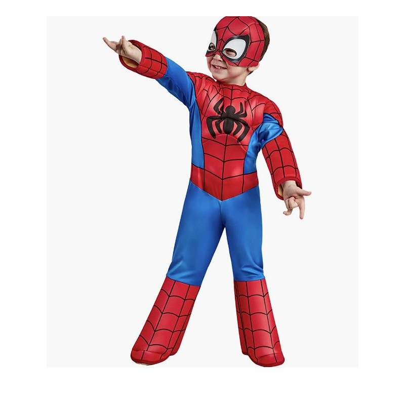 Prodotto ufficiale Spidey and His Amazing Friends creato da Rubies Spider man Ghost Spider e Miles Morales fanno tutti parte della banda di Disney in Marvel s Spidey His Amazing Friends la prima serie prescolare prodotta da Disney Animation Spidey Senses formicolio di gioia con questo adorabile costume per bambini Spider Man con petto imbottito e tuta con braccia insieme a un copricapo in tessuto