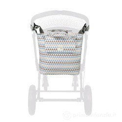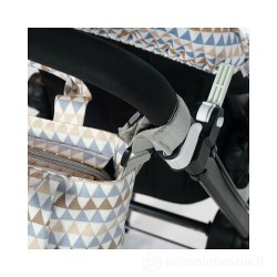 La borsa ha un sistema di fissaggio universale, con 2 manici corti regolabili che facilitano il posizionamento su qualsiasi modello di passeggino. Include anche una lunga tracolla.