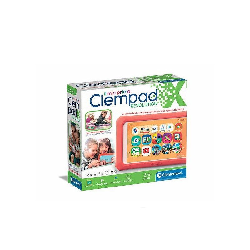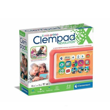 Il Mio Primo Clempad X Revolution Clementoni è un vero tablet Android progettato per il primo approccio dei più piccoli al mondo digitale per un divertimento adeguato da vivere in totale sicurezza Un dispositivo completamente progettato per i bambini dai contenuti educativi preinstallati ai colori e alla grafica delle icone che seguono le tendenze del momento
