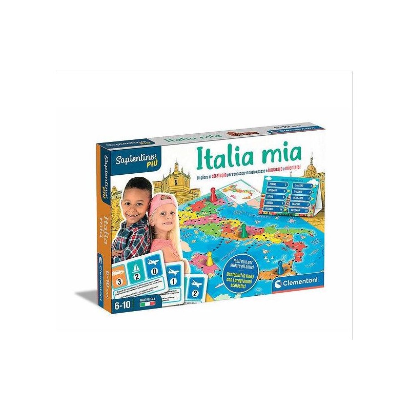 Un fantastico gioco educativo a quiz di Sapientino per approfondire le conoscenze del nostro bellissimo Paese e imparare a orientarsi in una mappa geografica Tanto divertimento a spasso per l Italia un divertente gioco di percorso per imparare a orientarsi scoprendo le bellezze del bel paese Il gioco contiene un tabellone fronte retro che riporta sia la cartina fisica che quella politica dell Italia schede itinerari e quiz sulle città visitate Attraverso le carte illustrate i bambini devono costruire il proprio itinerario visitando un gruppo di città italiane e spostandosi via mare via terra e via aereo Inoltre grazie ai tanti quiz e alle curiosità sulle città visitate vengono arricchite le conoscenze geografiche dei bambini per supportarli nel loro percorso scolastico attraverso il gioco Questo gioco può essere utilizzato come divertimento per tutta la famiglia un gioco da tavolo per sfidarsi sulle conoscenze circa l Italia e le sue caratteristiche Per imparare divertendosi in compagnia di Sapientino Più questo gioco educativo sulla geografia è pensato per bambini dai 6 anni Made in Italy