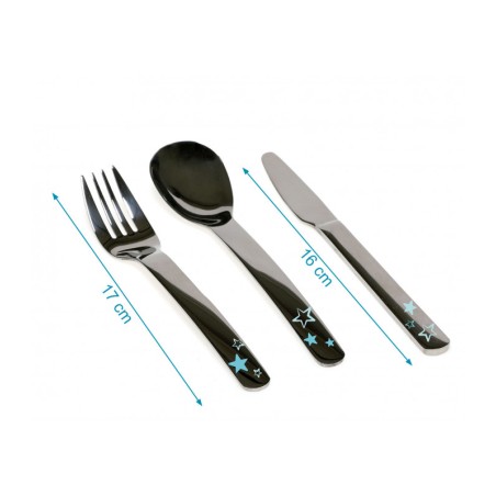 Questo set di tre posate per bambini in acciaio inossidabile cucchiaio forchetta e coltello è pensato per i bambini un po più grandi che sono già abituati a utilizzare qualche altro tipo di copertura incisore e vogliamo che facciano il passo successivo abituandosi all uso di posate il più possibile simili a quelle degli adulti Ideale anche quando preferiamo rimuovere la plastica a contatto con gli alimenti