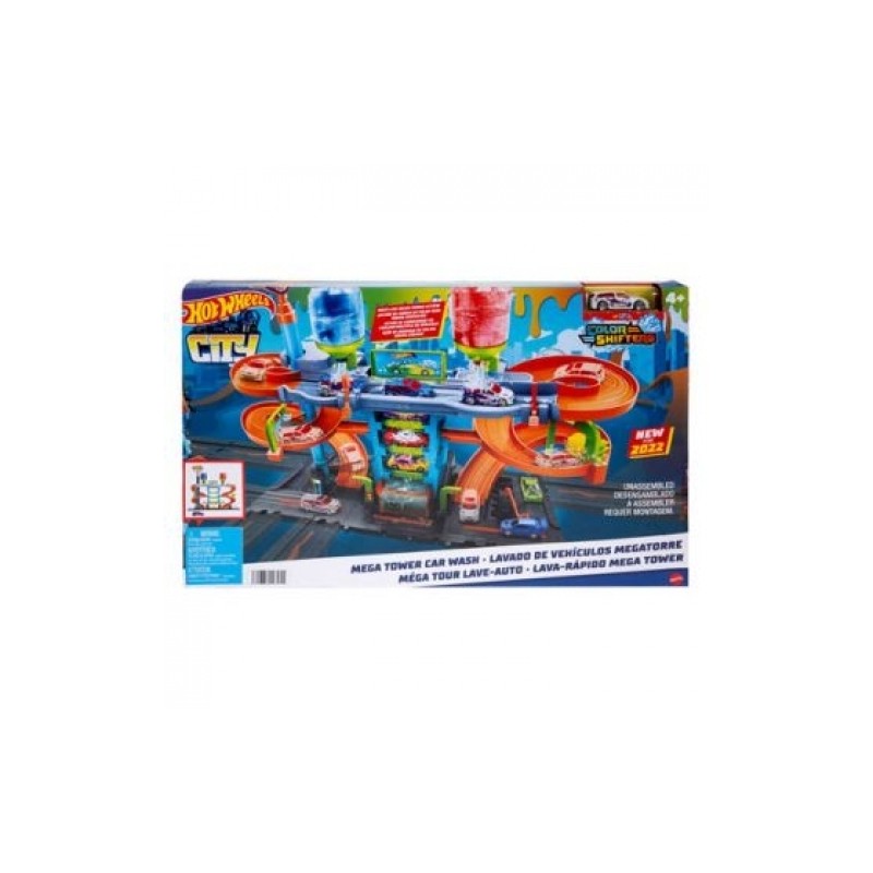 Con la Mega Torre Autolavaggio Hot Wheels City puoi divertirti senza sporcare Entra nell imponente autolavaggio e ruota la maniglia per spostare la macchinina lungo la spirale rotante Nella parte superiore ci sono due serbatoi che spruzzano acqua calda e fredda sul veicolo Color Shifters incluso per modificarne magicamente il colore Gli scomparti strategicamente posizionati catturano le gocce mentre le macchinine percorrono il resto del set senza schizzi