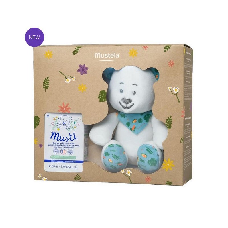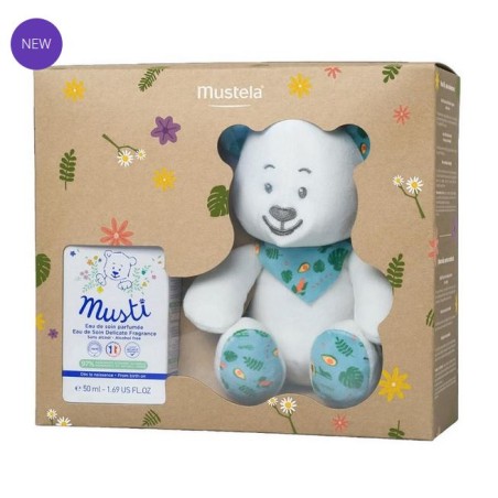 L Acqua Profumata Musti piacevole e leggera è un acqua senza alcool con un mix aromatico di delicati fiori bianchi e di mughetto Cofanetto composto da acqua Profumata Mustì e da un morbidissimo orsacchiotto realizzato in plastica riclata