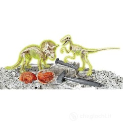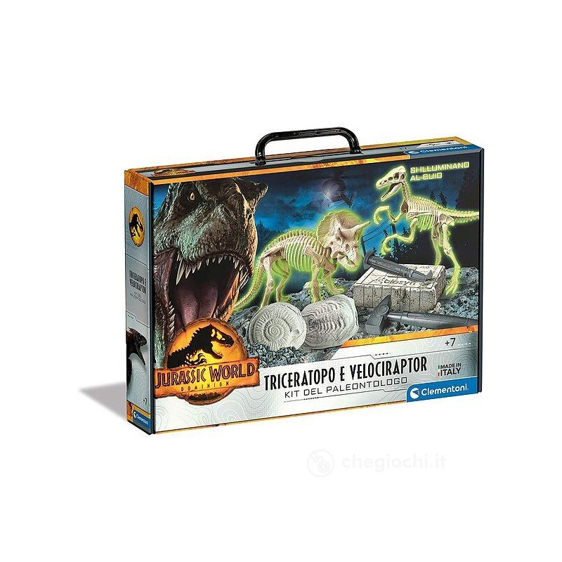 Il mondo dei dinosauri non è mai stato così divertente con questo gioco scientifico firmato Jurassic World Dominion pensato per gli appassionati del film e per veri aspiranti paleontologi Basta scavare i mattoni per riportare in vita gli scheletri dei più famosi dinosauri del passato il temibile Triceratopo e il Velociraptor Il kit contiene martello scalpello e due mattoni da scavare per recuperare gli scheletri dei dinosauri Questo kit fossili da scavare include anche due stampini per realizzare dei fantastici fossili con la creta Basta assemblare gli scheletri per fare un salto nel passato per vivere avventure giurassiche E se spegnete la luce li vedrete brillare al buio perché questi fossili sono fluorescenti Un gioco scientifico per far avvicinare i bambini alla paleontologia in modo facile e divertente consigliato per bambini dai 7 anni appassionati dei dinosauri Il manuale illustrato incluso guiderà il bambino alla scoperta di tante curiosità sui dinosauri e sul loro habitat Made in Italy