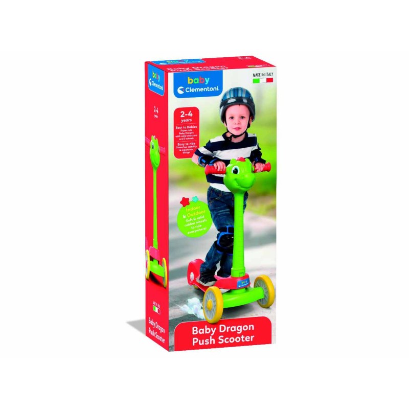 Un simpatico draghetto monopattino Baby Clementoni pensato appositamente per i più piccoli per accompagnarli verso incredibili avventure Un design accattivante ed empatico dei veri e propri giocattoli ma con caratteristiche e qualità dei veri monopattini Colorato e divertente questo draghetto è un ottimo alleato per divertirsi in totale sicurezza Perfetto per giocare dentro e fuori casa e facile da guidare grazie alle ruote in gomma da interno ed esterno allo sterzo maneggevole e alla struttura ergonomica il bambino può giocare in tutta tranquillità e spensieratezza 100 Made in Italy Monopattino a 3 ruote le 3 ruote favoriscono una maggiore stabilità la struttura è solida e stabile progettata per non ribaltarsi il telaio robusto e le maniglie in gomma morbida lo rendono un monopattino ideale anche per i bambini più piccoli Grazie al design del personaggio i più piccoli saranno maggiormente coinvolti e potranno scatenarsi nel gioco e nell immaginazione Un gioco prima infanzia studiato per lo sviluppo psicomotorio cognitivo sensoriale ed emotivo e consigliato a partire dai 2 anni