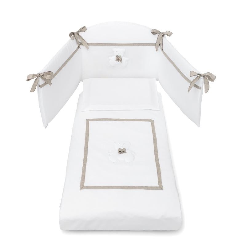 Bubu Set Piumone Sfilabile di Erbesi è coordinabile ai lettini della Collezione Bubu e presenta sia sul piumone che sul paracolpi un dolcissimo orsetto ricamato arricchito da un elegante fiocco