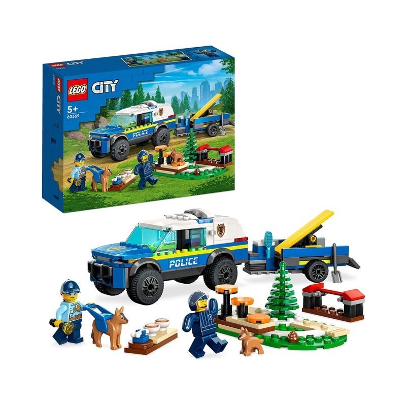 Questo set LEGO City include una macchina della polizia giocattolo con rimorchio 2 minifigure una figura di cane e una di cucciolo e 3 attività per giocare ad addestrare i cani