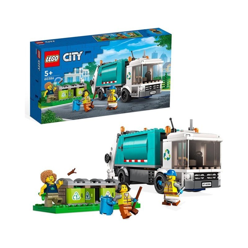 Insegna ai bambini a prendersi cura dell ambiente con il fantastico camion giocattolo per il riciclaggio dei rifiuti LEGO City dotato di centro di riciclaggio contenitori 3 minifigure e una figura di gatto