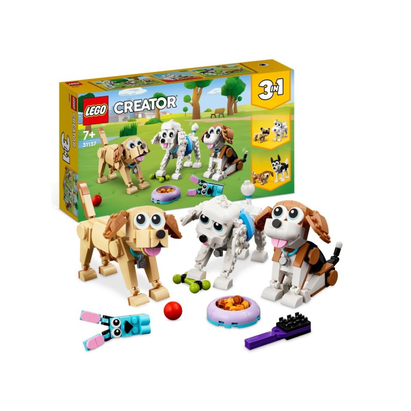 Gli amanti dei cani e i bambini dai 7 anni in su possono divertirsi giocando con una selezione di simpatiche razze in questo set costruibile Cani adorabili 3 in 1 LEGO Creator 31137 Contiene un beagle un barboncino e un labrador con teste code e orecchie snodabili più accessori tra cui una ciotola per il cibo una spazzola un coniglio giocattolo una palla e un guinzaglio per portare a spasso il cane per aggiungere ulteriore divertimento alle storie di fantasia dei bambini
