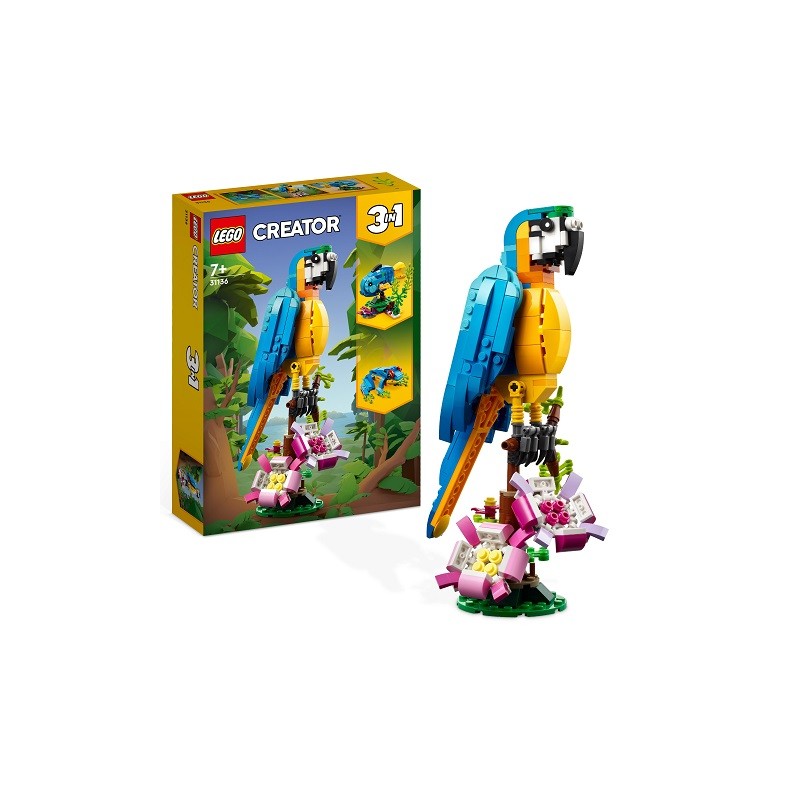 I piccoli costruttori e gli appassionati fan degli animali dai 7 anni in su possono addentrarsi nella foresta pluviale per storie ricche di azione con questo set da costruzione Pappagallo esotico 3 in 1 LEGO Creator 31136 E' dotato di un pappagallo colorato che può ruotare completamente il suo corpo seduto su un ramo di un albero e muovere le ali e la coda