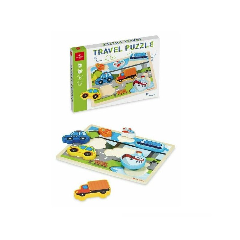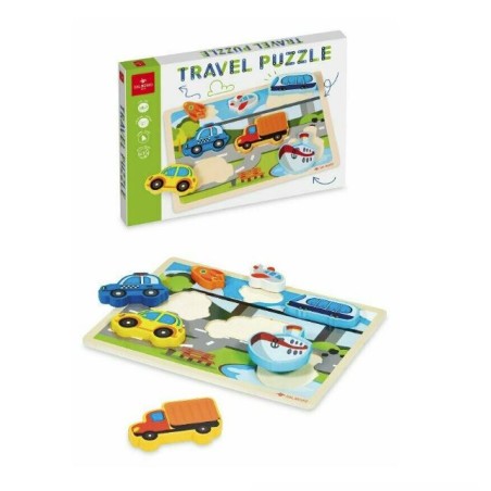 Travel Puzzle il puzzle in legno con veicoli sagomati che facilitano il bambino a riconoscere i mezzi di trasporto cercando la forma corretta in cui posizionarli Sviluppano la percezione visiva e stimolano la coordinazione occhio mano