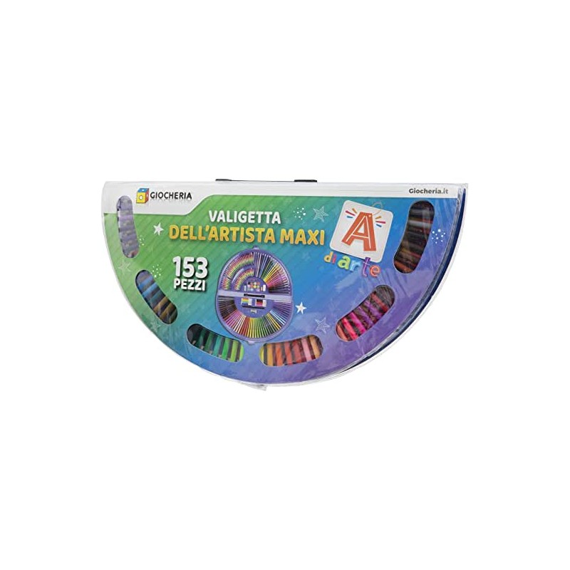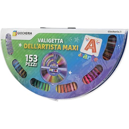 Valigetta richiudibile con 12 acquerelli 24 matite colorate 50 pennarelli 30 pastelli a cera 20 pastelli ad olio 10 pennarelli mini 1 spugna 1 pennello 1 temperino 1 matita HB 1 righello e 1 colla