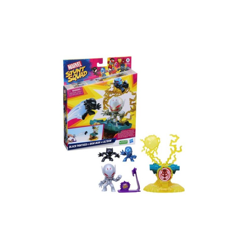 Mega eroi mega divertimento Il set di gioco Marvel Stunt Squad Heroes vs Villains presenta action figure in un unico set per un gioco divertente Con famosi personaggi Marvel e un classico schema di gioco Heroes vs Villains queste piccole figure di supereroi sono piene di divertimento pieno di azione Questo set di gioco Marvel Stunt Squad Heroes vs Villains include action figure di Black Panther e Iron Man da 1 5 pollici una figura di Ultron deluxe un lanciatore e una base come bersaglio per sconfiggere il cattivo in più modi Copyright 2023 MARVEL Hasbro e tutti i termini correlati sono marchi commerciali di Hasbro PANTERE NERE E IRON MAN VS ULTRONE Il set di gioco Marvel Stunt Squad Heroes vs Villains consente ai bambini dai 4 anni in su di ricreare la resa dei conti con i loro personaggi preferiti base a cui mirare SET AIM GO posiziona semplicemente la figura del supereroe Marvel Stunt Squad sul lanciatore mira e vai Il giocattolo offre già un divertimento pieno di azione DIVERSI MODI DI GIOCARE con questo set di gioco Marvel Stunt Squad i bambini possono creare le proprie avventure di gioco in modo giocoso Puoi giocare da solo o invitare amici e familiari a unirsi a te SONO DISPONIBILI PIU' FIGURE E SET DI GIOCO STUNT SQUAD MARVEL Le action figure Marvel Stunt Squad sono compatibili con ciascuno dei playset Ogni personaggio è venduto separatamente soggetto a disponibilità