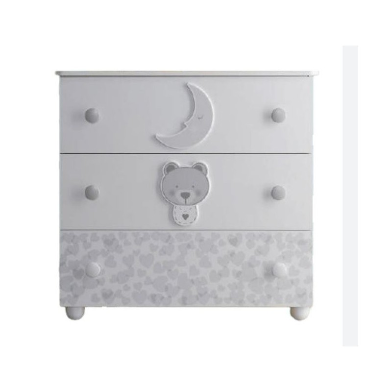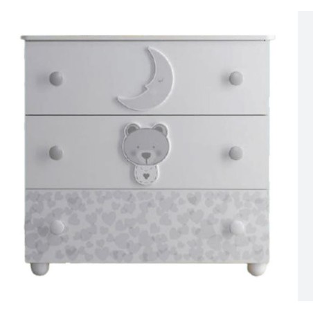 Il Comò Moon è composto da una solida struttura in legno con 3 ampi cassettoni ed ogni cassetto è dotato di due pomoli a forma tonda ed è abbellito con decori in rilievo raffiguranti cuori orsachiotto e luna simboli della collezione Moon