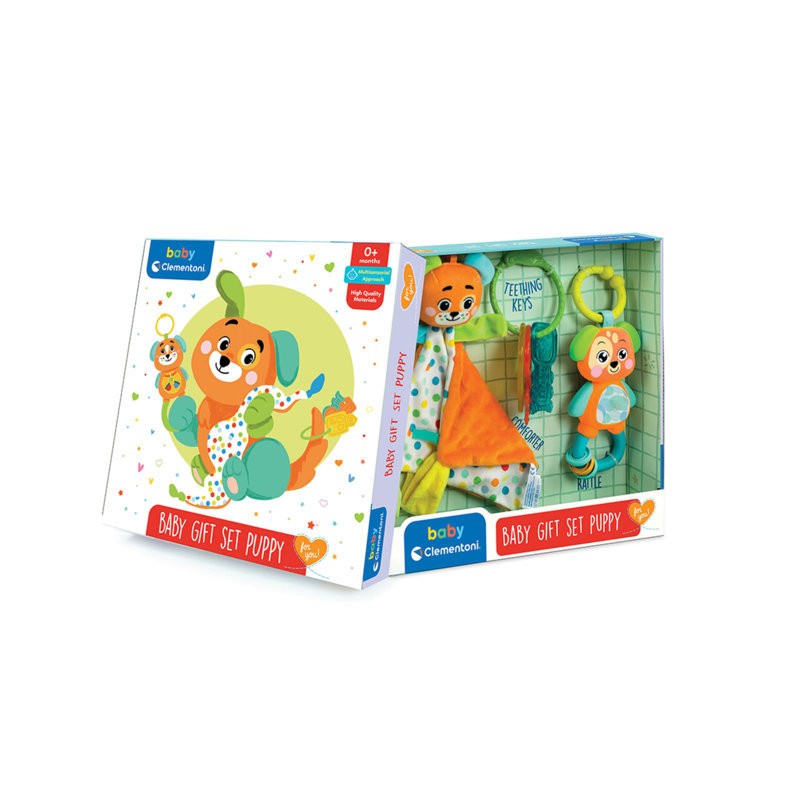 un tenero comforter un sonaglino coloratissimo e delle chiavi moridicchiose in plastica morbida Un colorato rattle con le sembianze di un dolce cagnolino ricco di elementi in gomma e un comodo anello per appenderlo le chiavi mordicchiose favoriscono lo sviluppo della dentizione mentre il comforter con le sembianze di un simpatico cagnolino sarà il primo compagno di giochi dei bambini I colori vivaci i suoni gli elementi mobili e i vari materiali sono pensati per facilitare lo sviluppo multisensoriale del bambino Made in italy
