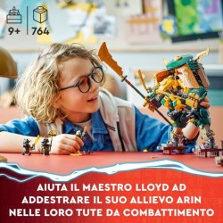 Questo inedito set di giochi ninja contiene 2 action figure mech con parti snodabili un mech del maestro NINJAGO Lloyd e uno del suo allievo Arin Le due action figure mech possono essere combinate tra loro per dar vita a un grande mech ancora più potente e ricco di armi per offrire infinite opportunità di gioco creativo e di azione Questo gioco da battaglia include le minifigure dei personaggi LEGO NINJAGO del maestro ninja Lloyd armato con 2 katane e del suo allievo ninja Arin con 2 katane e un rampino Gli eroi ninja sono pronti a combattere contro il malvagio trio costituito da Rapton armato di una spada giocattolo Imperium dal Comandante della Guardia Imperium dotato di un bastone e dal Generale Claw Imperium anche esso con una spada Imperium