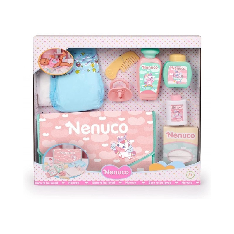 Tutto ciò di cui hai bisogno per cambiare il pannolino di Nenuco è nella sua graziosa borsa fasciatoio un fasciatoio portatile due pannolini borotalco lozione per bambini crema un pettine un ci