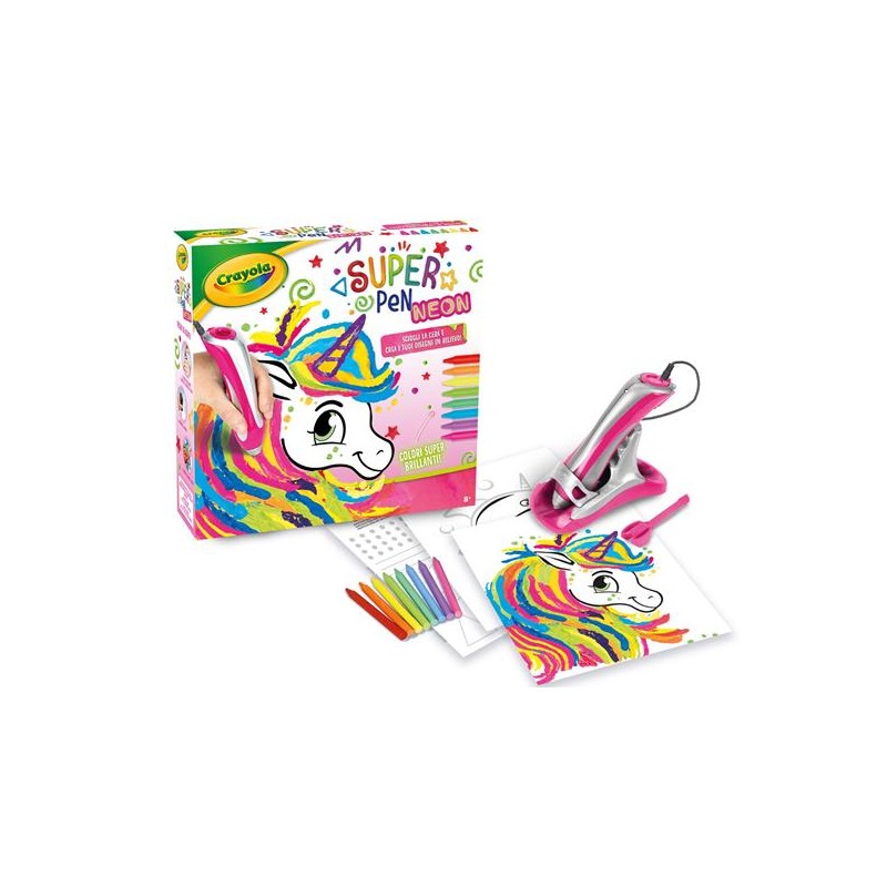 Super Pen sciogli la cera e crea i tuoi disegni in rilievoScatena la creatività con Super Pen la speciale penna di Crayola che permette di sciogliere la cera dei pastelli per creare i tuoi disegni in rilievo E' facile e divertente basta caricare nella penna i pastelli a cera inserire la spina e il gioco è fatto Il calore fa sì che la cera si sciolga e fuoriesca dalla punta della penna permettendo di scrivere colorare decorare con precisione tanti tipi di materiali come carta cartoncino legno tela vetro e altro ancora La confezione contiene Unità Super Pen con base di appoggio 8 pastelli a cera 1 strumento multifunzione adattatore 3 fogli per fare pratica 20x25cm guida rapida e istruzioni