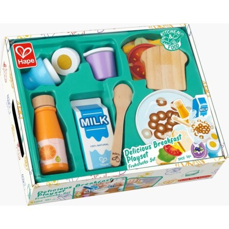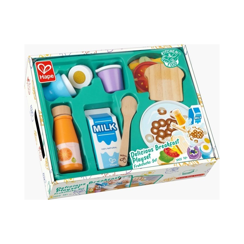 COSA E' INCLUSO Perfetto per insegnare ai bambini le caratteristiche del cibo questo playset include yogurt latte succo d arancia un uovo con portauovo un panino e ha una ciotola realistica di farina d avena con un cucchiaio di legno