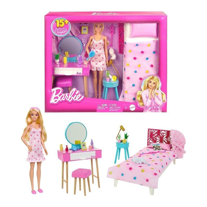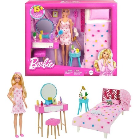 Questo set della camera da letto di Barbie ispirerà dolci storie di giorno e di notte La bambola Barbie è accompagnata da un gattino assonnato e 20 coloratissimi pezzi a tema per la sua camera da letto